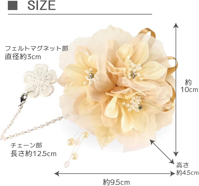 ■サイズ:花部縦約10cm 横約9.5cm 高さ約4.5cm チェーン部: 12.5cm フェルトマグネット部:直径3cm ※平置きの実寸サイズです。製品により多少の誤差が生じる場合がございます。 ■重さ:約14g ■カラー: ピンク