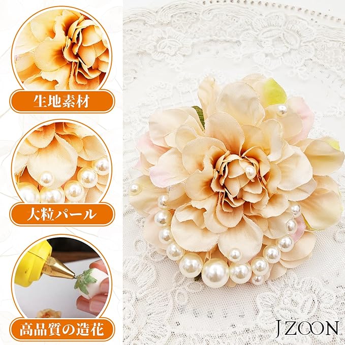 「様々な場面に適用」 入園式、卒業式、結婚式、挙式、披露宴はもちろん、発表会、二次会、パーティーやイベント等でもお使いいただけます。コサージュとしてだけでなく、和装のヘアアクセサリーとしてもお使い頂けます。 様々な場面に、華やかなダリアがお祝いの雰囲気を演出します。大変オススメです。