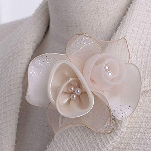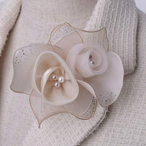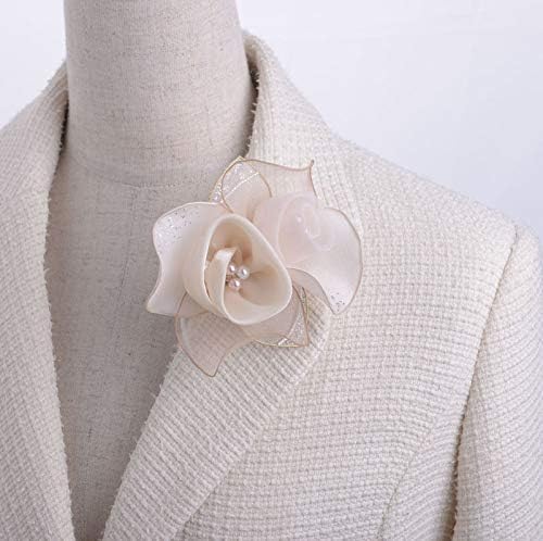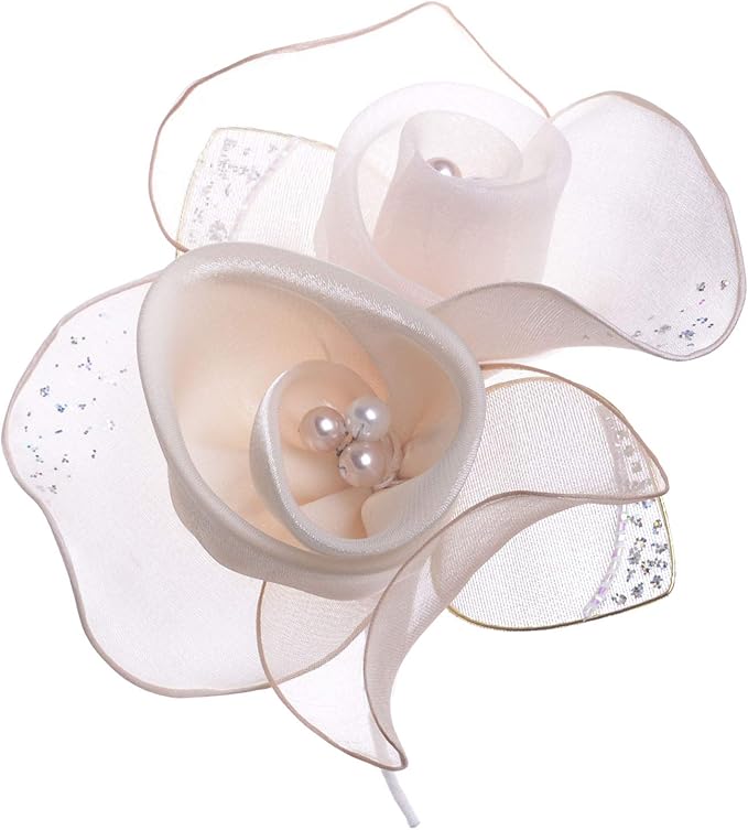 パールの花弁をシフォンとオーガンジーの質感の異なる花びらで巻き包んだ繊細なコサージュです。大き過ぎずフォーマルなスーツとのバランスも○ ラメは控えめながらオーロラが入っているので、ハレの場にふさわしい華やかさも兼ね備えています。
