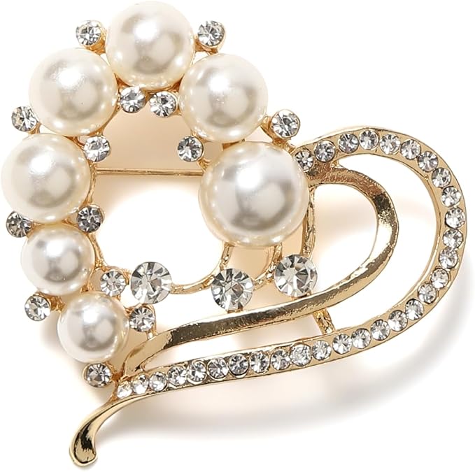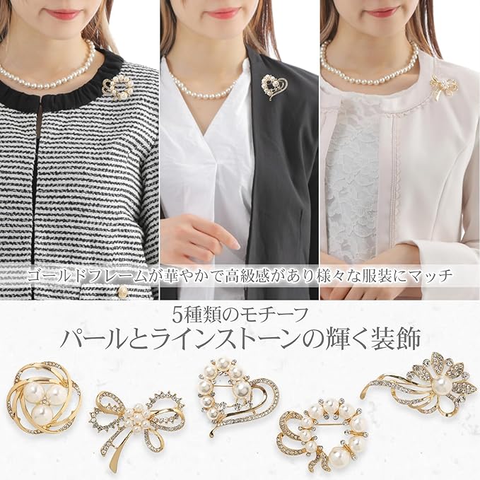 【簡単装着】ピンで留めるブローチ。無理無く簡単に装着できます。5種類のモチーフデザインで、ラインストーン、パールがとても綺麗で華やか。ワンポイントのアクセントでとても素敵です。