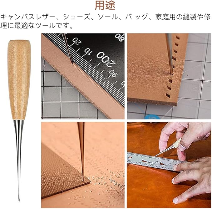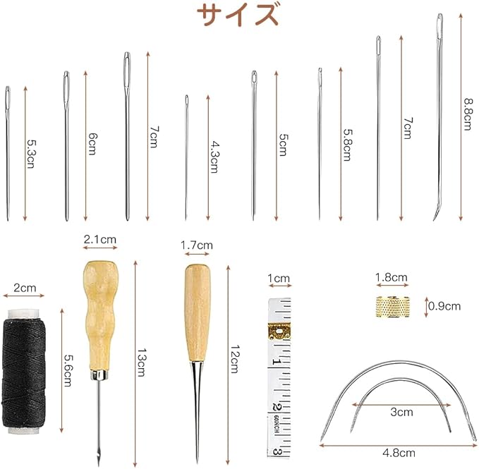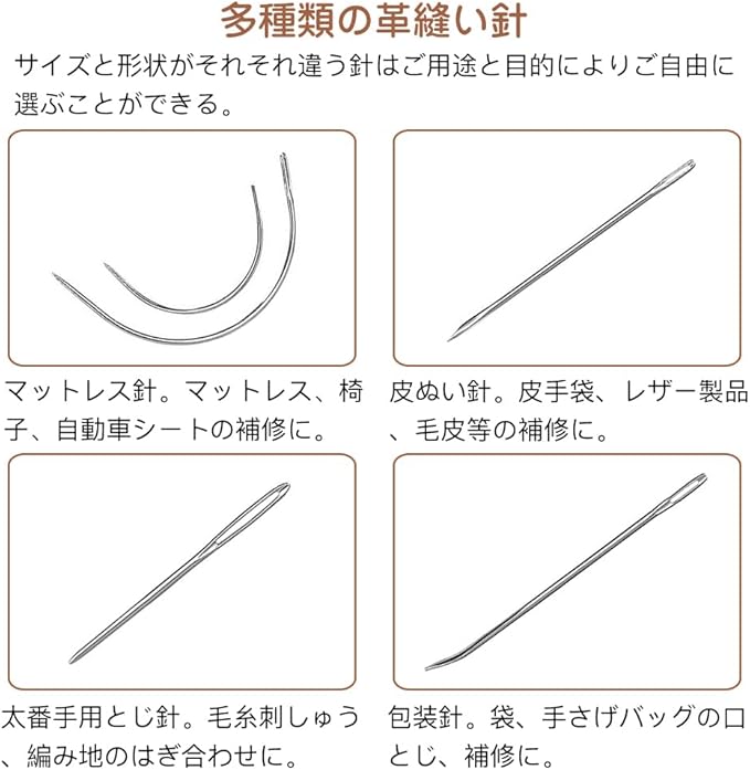 多種類の革縫い針:針先が丈夫で鋭いです。革用の工具セットに様々なサイズと形をしている針先があります。結び目の針と先鋭い針、三角針、カーブ針なども含まれます。