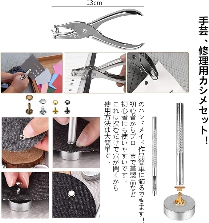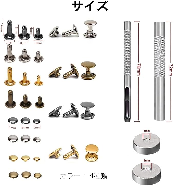 【使いやすい】:このカシメ金具は手芸、修理用スタッズ セットです。手芸用スタッズセットで、6/8/12mmのスタッズを取り付けるのに便利な工具とスタッズのセットです。使用方法は大簡単で、初心者からプローまで革製品などのハンドメイド作品簡単に飾るできます
