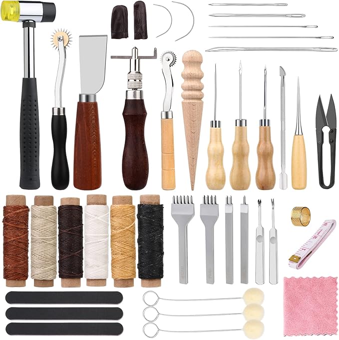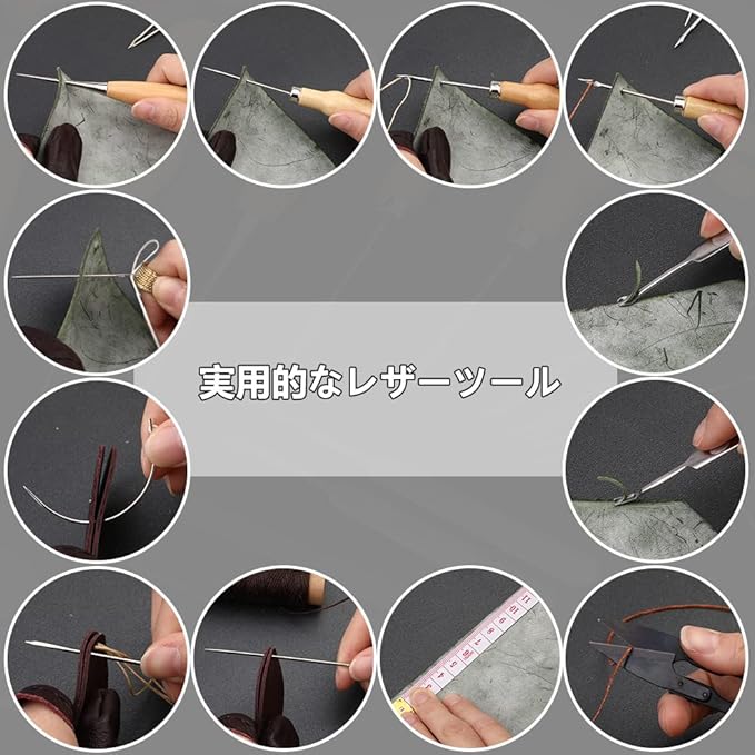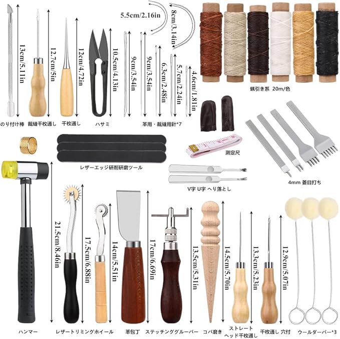 便利な裁縫セット: レザークラフトセットでは、ステッチンググルーバー、ステッチルレット、4本の菱目打ちがセットになっています。菱目穴は縫い目を美しく、均等にします。仕上がりもぐんとよくなります。また、各種のレザー針と高品質のワックス糸を厳選して揃えており、裁縫の出来栄えが多彩になります。