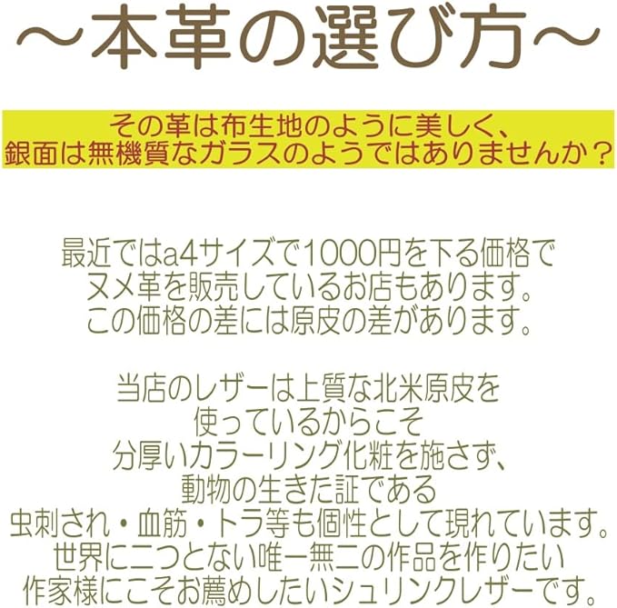 上質な北米原皮、姫路産日本製一枚革を使いやすい大きさにカットしました。柔らかくしなりがあり、初心者の方にも扱っていただきやすい革です。