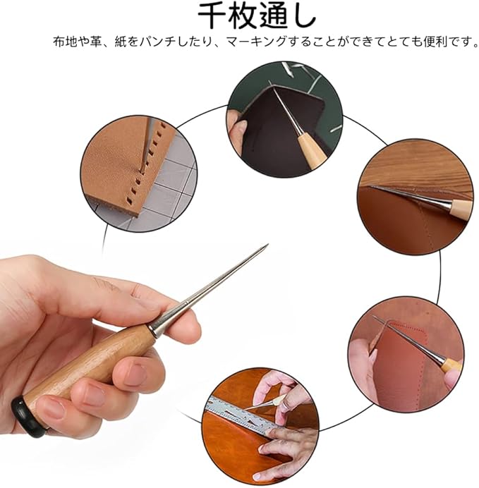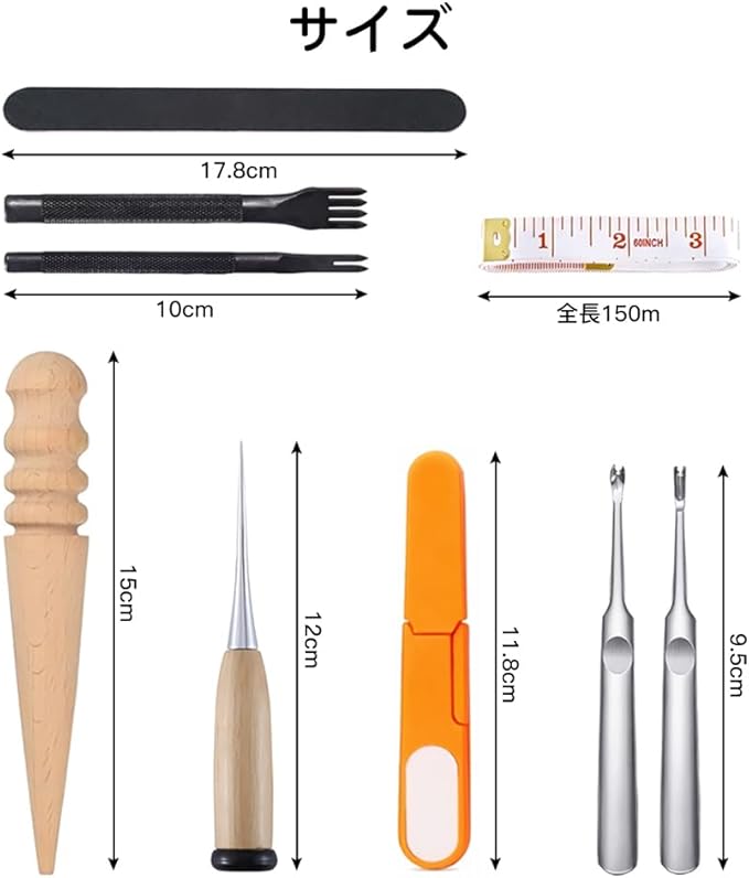 セット内容:計24点セット。千枚通し*1、系*3、指カバー*2、裁縫用針*7、ハサミ*1、指貫*1、測定尺*1、溝堀り革工具*2、レザーエッジ研削研磨ツール*3、菱目打ち*2、コバ磨き*1。