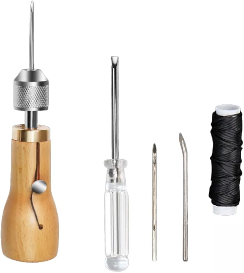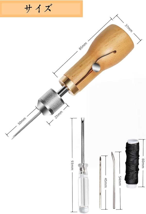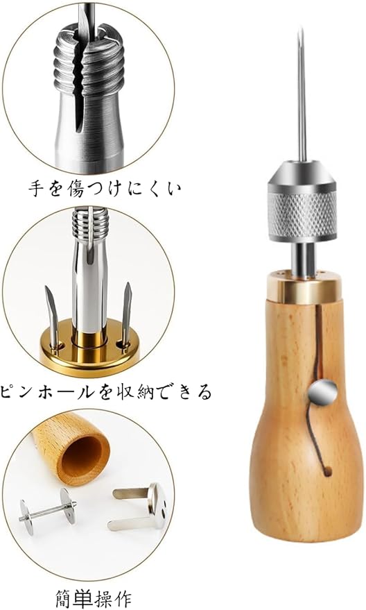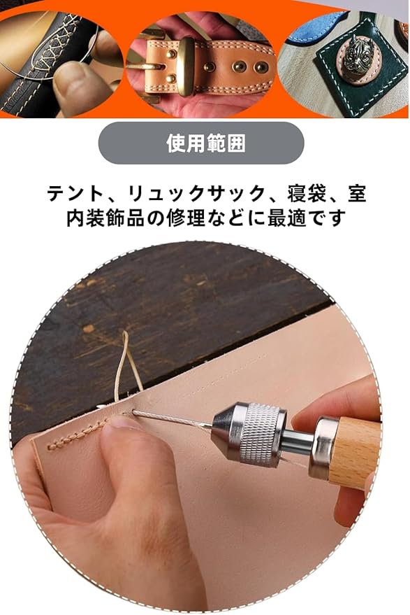 【簡単操作】手触りの良い木製グリップを採用し、力が込めやすく、针は太く貫通力に優れているので、厚手の生地を楽に縫い付けできます。さまざまなレザークラフトを作ることができます。