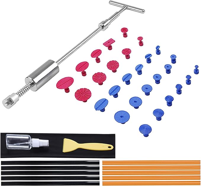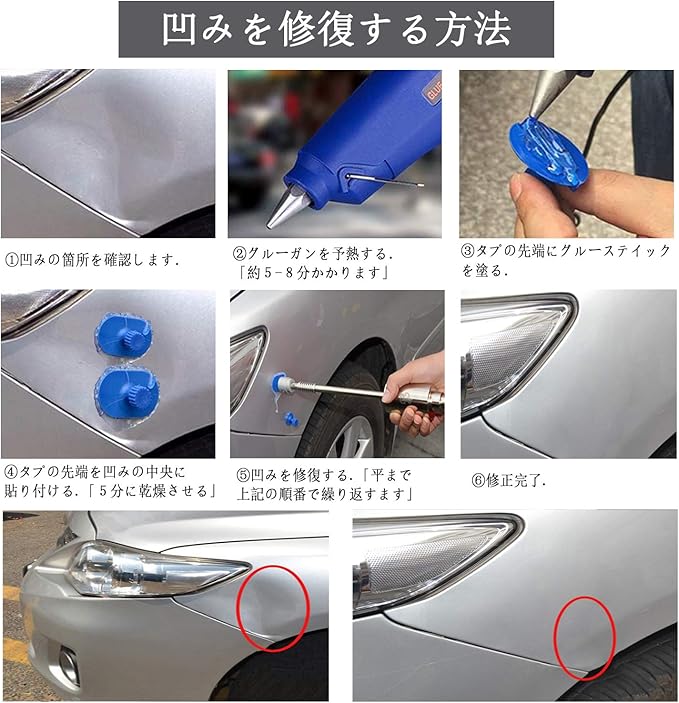 注意事項:①使用の際に、グル―ガンは別途購入が必要です;②大き過ぎる凹み、小さすぎる凹み、鋭角についている凹み、プレスラインにかかっている凹み等に関しては修復不可な場合がございます。③これはDIYの簡単作業で100%完全な修復を保証されないです。作業方法と個人的原因によって、修復効果も違います。