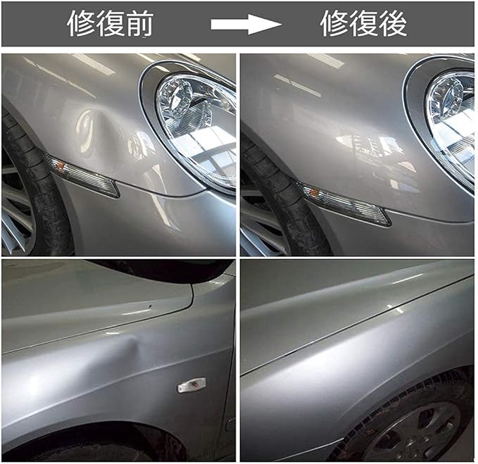 注意事項:①大き過ぎる凹み、小さすぎる凹み、鋭角についている凹み、プレスラインにかかっている凹み等に関しては修復不可な場合がございます.②これはDIYの簡単作業で100%完全な修復を保証されないです。作業方法と個人的原因によって、修復効果も違います.
