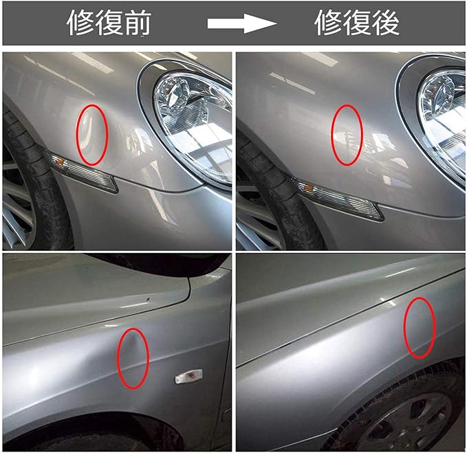 注意事項:大き過ぎる凹み、小さすぎる凹み、鋭角についている凹み、プレスラインにかかっている凹み等に関しては修復不可な場合がございます。これはDIY修理工具で100%完全な修復を保証されていませんが、作業方法と個人的原因によって、修復効果も違います.