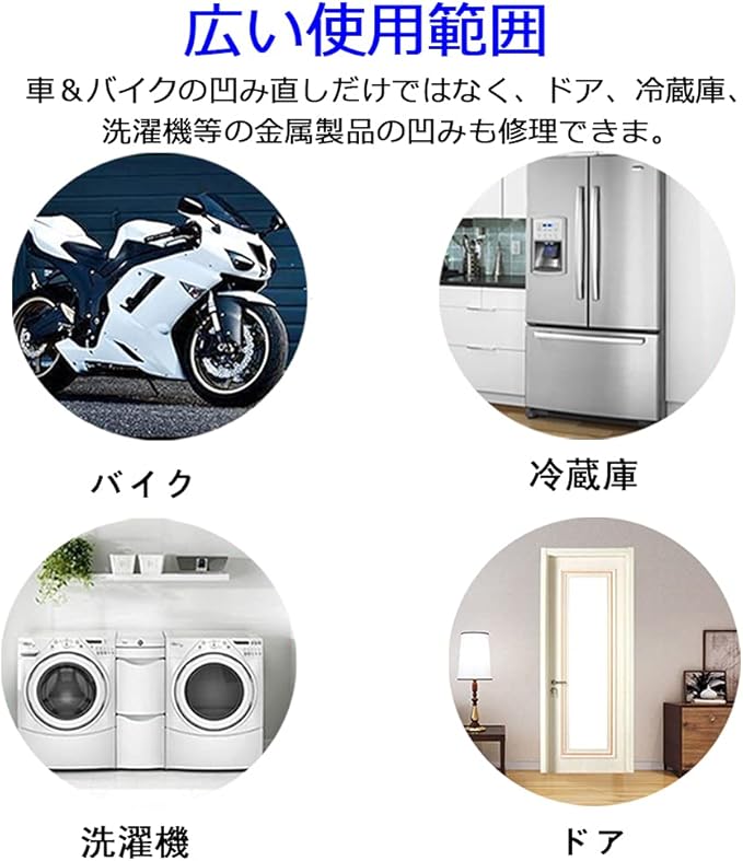 使用範囲:ボディ&フェンダー補修ツール、車&バイクの凹み直しだけじゃなく、他の金属製品の凹みも修復できます。たとえばドア、冷蔵庫、洗濯機などの凹みも修復できます、用途が広いです。