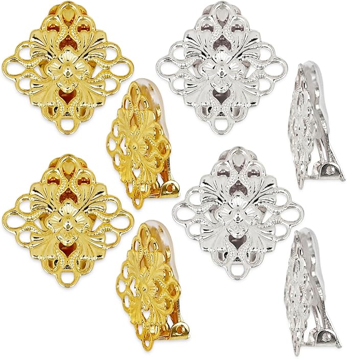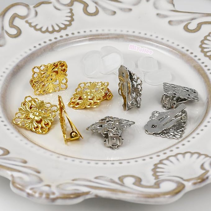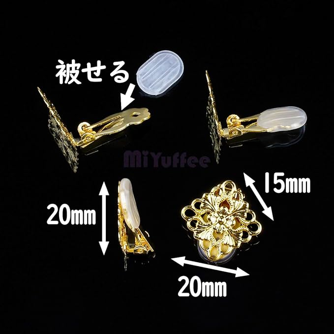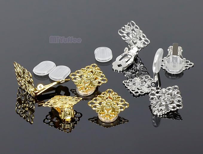 四角台座・透かしパーツ付きのイヤリングクリップとシリコンカバーのセットです。ビジューやパールやビーズなどで華やかなイヤリングを手作りしたり、耳たぶに挟むように使うタイプのイヤリングを作成するためのハンドメイド用金具です。