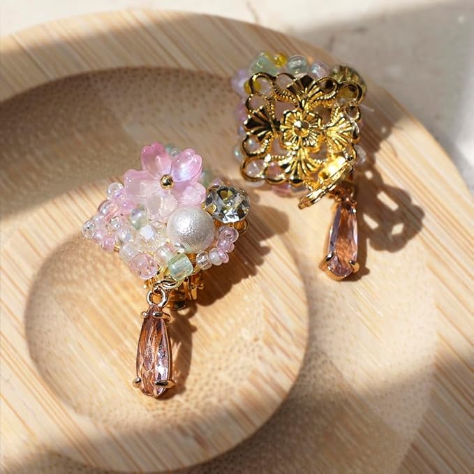 バネ式のイヤリング金具で、裏面の金具面積が大きいので耳に着けた時に安定感があります。シリコンカバーが付属しており、通常のイヤリングより痛くなりにくいです。金属アレルギーの方、お子供様にもオススメです。