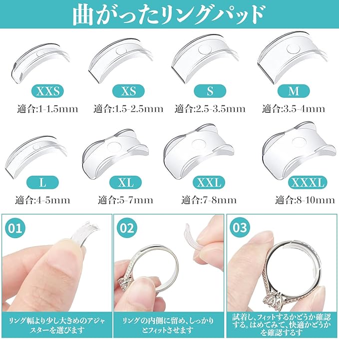 ✅️【多様なアクセサリーの組み合わせ】リングアジャスター12点セットは、XXSからXXXLまでの8つのサイズをカバーする8個の曲がったリングパッド、透明なスプリングコード4本、丸型と平型。さまざまなサイズのリングに適合し、完璧なフィット感を提供します。