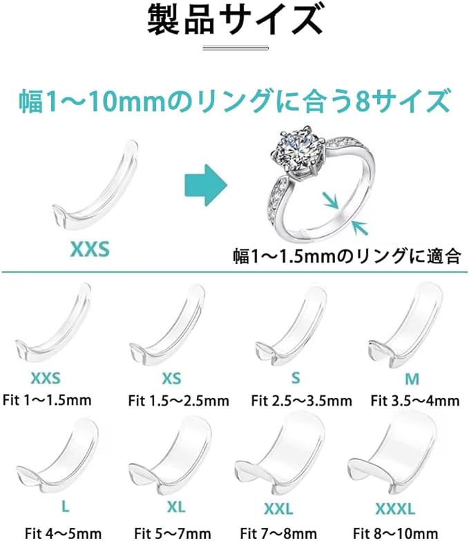 【8サイズ対応】幅1mm~10mmの指輪に最適なリングアジャスター。ピンキーリングから太い指輪まで、サイズ調整が簡単にできます。リング サイズ調整や指輪 ズレ防止に便利なアイテムです。