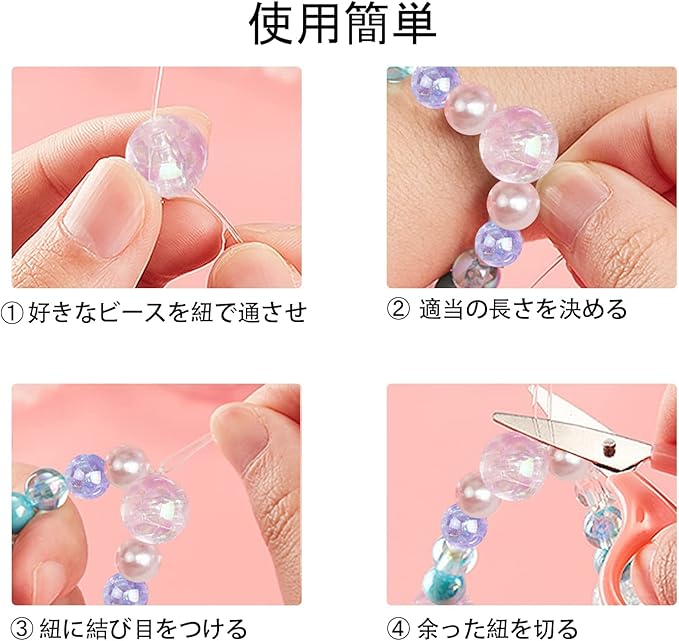 ビーズは安全で退色しないアクリル、鉛、ニッケルを含まないもので作られています。提案:まず、ビーズを適切な長さに着用し、次に結び目を作り、最後に紐を切ります。