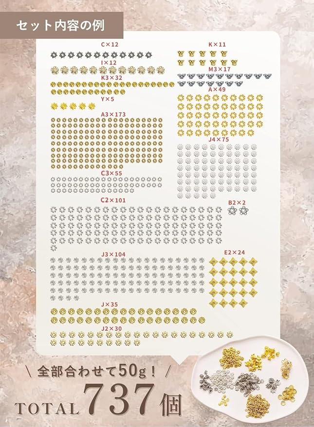 ✓入荷時期により、入っているパーツの種類や色味が若干異なる場合がございます。予めご了承くださいませ。