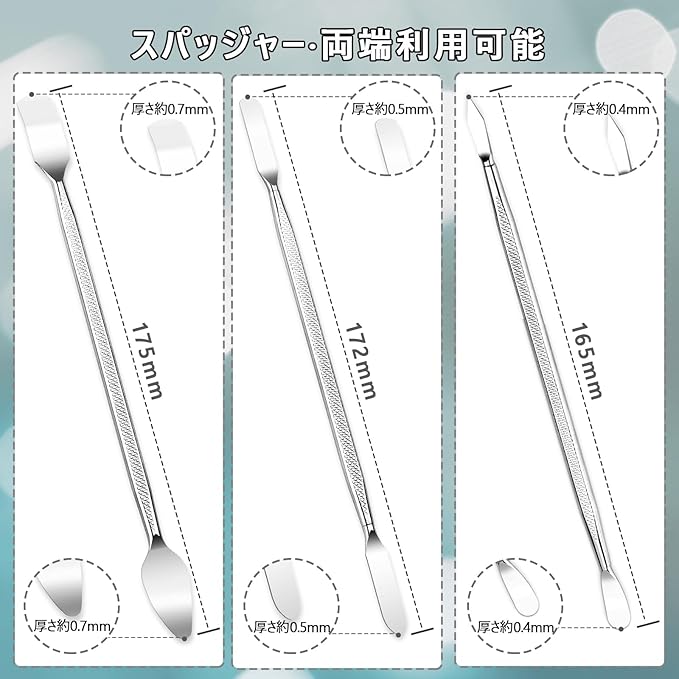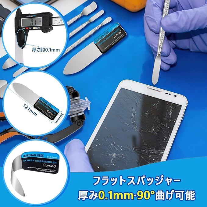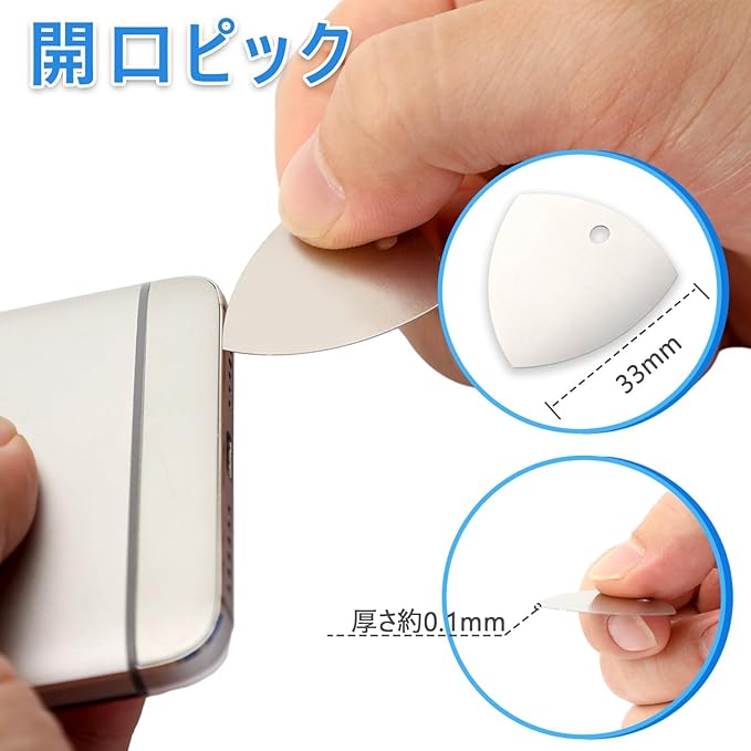超薄のケースオープナー:3本のスパッジャーも両端利用okで、先端の形と厚みがそれぞれ異なって、幅広く適用できます。更に、フラットスパッジャーの刃先は厚み0.1mmにレーザーカットされていて、より小さな隙間に深く入り込むことができます。柔らかい反り刃は高い靭性を持ち、90度曲げても変形して壊れない、曲面スマホの分解も簡単です