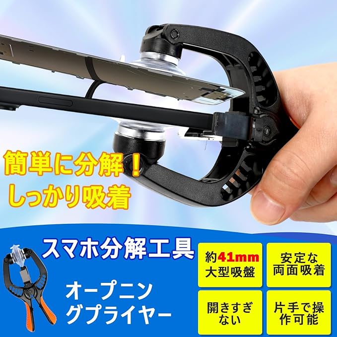 オープニングプライヤ付き:スマホの分解・修理に欠かせないツールです。このオープニングプライヤは両面にも直径約41mmの大型吸盤がついているので、吸着力が強くてLCDスクリーンが簡単に落下しません。更に、片手で利用できて使い勝手がいいです