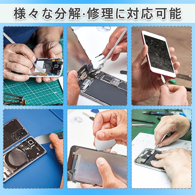 幅広く適用:携帯電話、スマホ、タブレット、ノートパソコン、パソコン、ゲームパッド、小型家電、おもちゃなどの分解・修理によく利用します。バッテリー交換やスクリーン交換、フロントパネル、デバイスの修理ツールとして活躍しているスマホ分解工具です