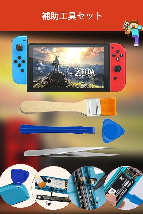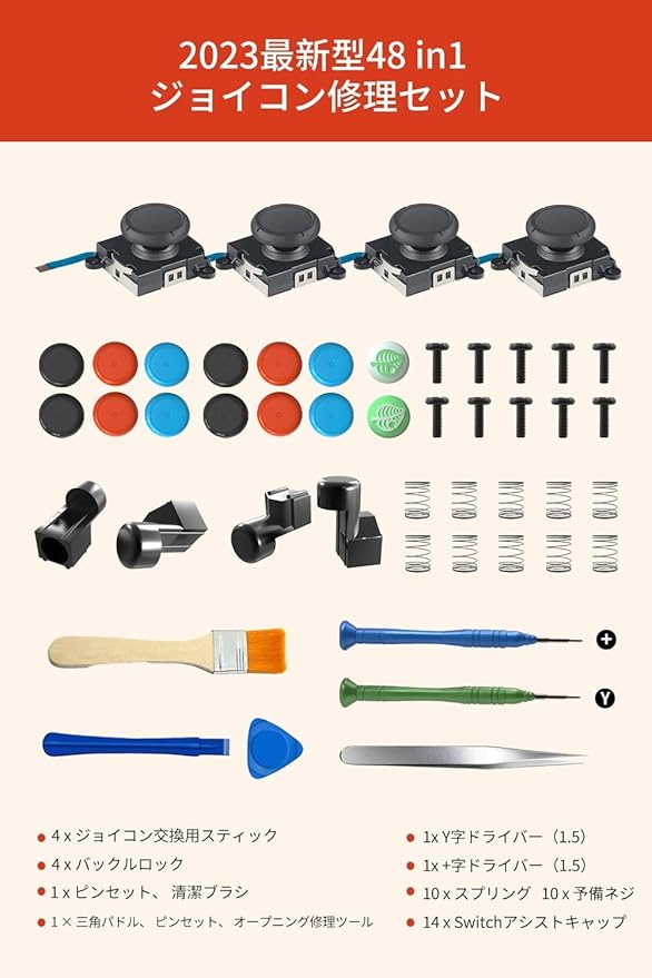 【48 in1セット内容】ジョイコン交換用スティック 4、バックルロックx4、Y字ドライバー(1.5)x1、+字ドライバー(1.5)x1、ピンセットx1 、オープニング修理ツールx1、三角パドル x1、清潔ブラシx1、予備ネジx12、指先のキャップx12、スプリングx10。