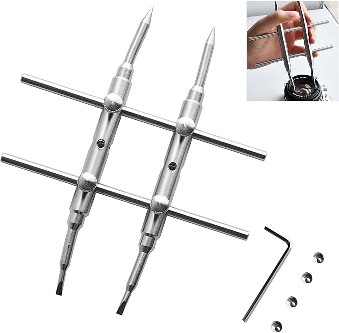 【両面チップ】このレンズレンチは2頭設計で、尖った先端と平らな先端の両方を備えており、レンズ保持リングの標準穴のノッチとスロットノッチに適している。アームとレールをしっかり固定して安定させる4本のネジがあります。