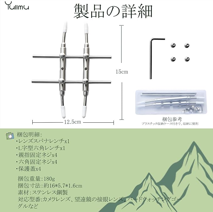 【使用方法】頭部の2本のネジと中間の2本のネジを回して、ジョー開口部幅を簡単に調整することができます。底部には2つのネジ穴があり、対応するネジを回して、必要に応じて長さを延長してレンズバレルの奥深く使えます。