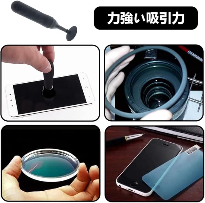 カメラやビデオカメラのレンズのメンテナンス、修理に欠かせないレンズ吸着カップのセットです。指紋や皮脂汚れを気にせず、レンズを取り外すことができます。
