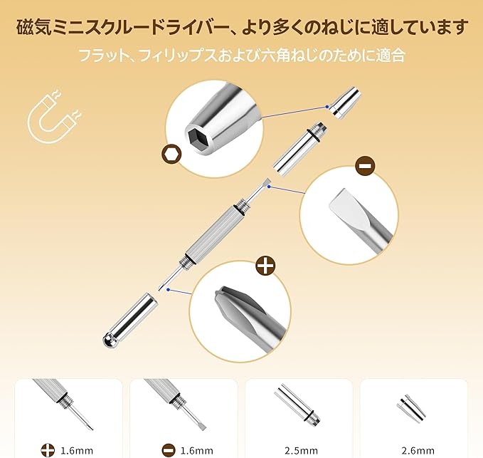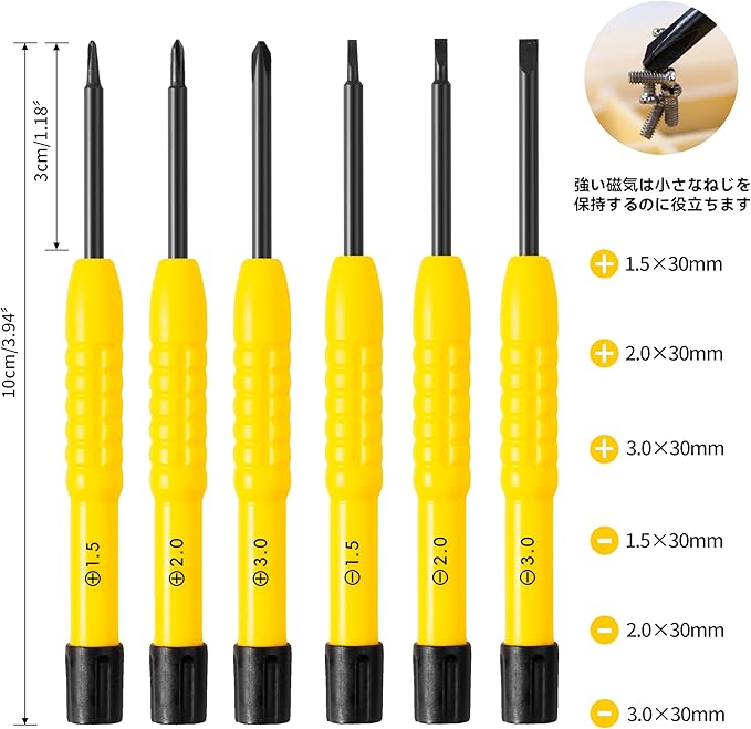 【磁気採用で落ちない精密作業】プラス(PH000/00/0)・マイナス(1.5/2.0/3.0mm)磁気ドライバー計6本が超極小ネジを確実に吸着。落下防止&ストレスフリー調整を実現。3WAYマイクロドライバーはキーホルダー付け可能で外出先でも即対応。