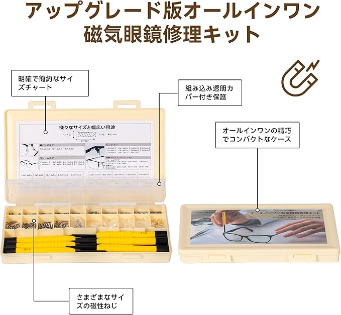 磁気付き眼镜修理キット 6本ドライバー 多機能コンパクトケース 鼻パッド調整工具 ネジ&ピンセット&クロス付き 精密メガネ修理セット