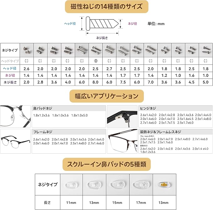 【錆に強く汎用性の高い極小ネジ】眼鏡専用に設計された防錆加工ネジ14サイズを完備。湾曲ピンセットで簡単に把持可能。フレームの種類を問わずあらゆる脱着ネジに対応。