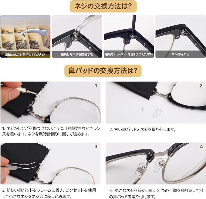 【コンパクト収納のプロ用修理キット】磁気付きプラス/マイナスドライバー各3本、極小ネジ14サイズ、シリコン鼻パッド10組(5サイズ)、精密ピンセット・マイクロドライバー・ワッシャー等、必要な工具/パーツをミニケースに完全収納。自宅で眼鏡店レベルの修理が可能に。