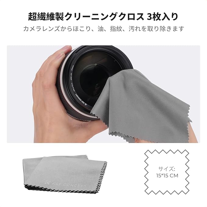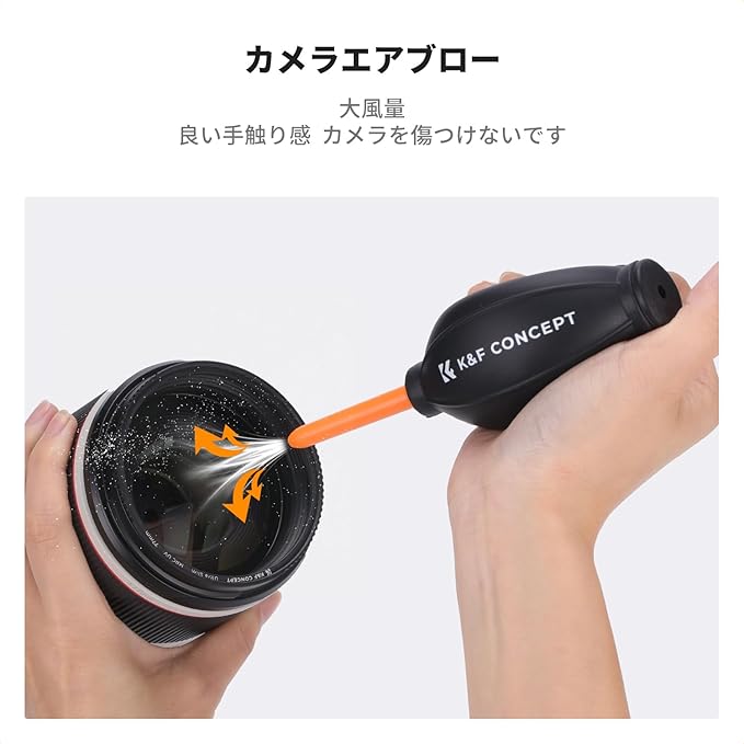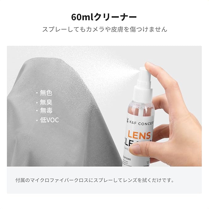 【60mlクリーナー・カメラエアブロワー】60ml洗浄液は精製水で作られており、純粋で不純物がなく、電子製品の表面の静電気を軽減し、ほこりなどの不純物の吸着を軽減し、人体に有害な成分は含まれていません。 少量のクリーニング液でスプレーして、同梱のマイクロファイバークロスを使うだけです。カメラエアブロワー: 持ちやすい、プロの表面処理が施され、良い手触り感、カメラを傷つけない。弾力性が強く、大風量、お手入れが簡単で、カメラやレンズからのほこりをきれいに除去されます。