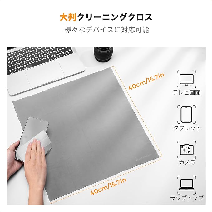 【2サイズクリーニングクロス】3枚入りの15cm四方クリーニングクロスと2枚入りの40cm四方クリーニングクロス。クリーニングクロスはマイクロファイバー素材で作られており、デバイスのほこりや汚れを素早く除去できます。水洗いできるため、洗って繰り返し使用可能です。
