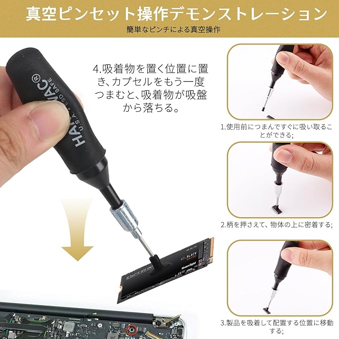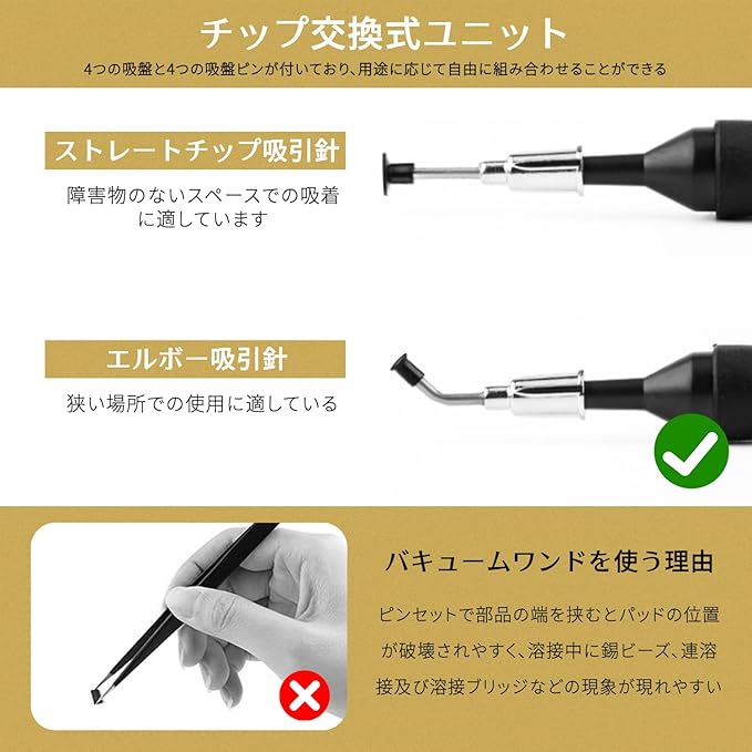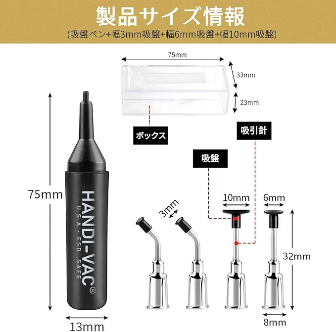 【基本構成】高精度真空吸引ペン(本体長90mm)と4サイズの交換用吸着カップ、の実用的なセット。