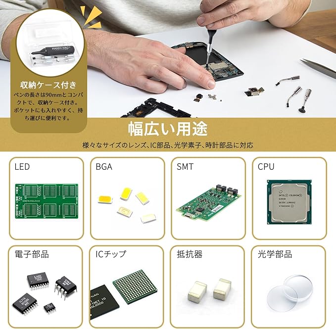 【専門的用途】カメラレンズ清掃、電子回路基板の修理、時計の精密部品交換など、プロフェッショナルな作業環境で活躍する多目的ツール。