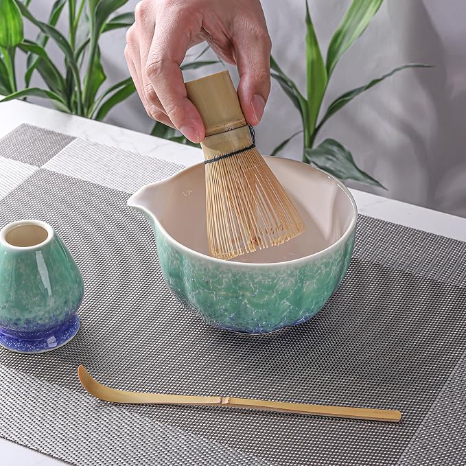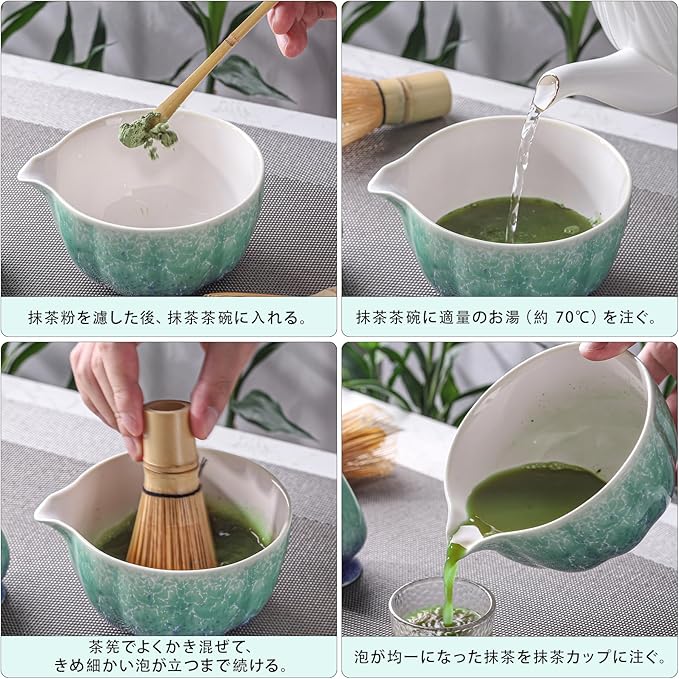 使用手順:茶さじで抹茶粉を抹茶茶碗に取り入れ、その後60~80℃のお湯を注ぎます。茶筅を使って抹茶を30秒ほど激しくかき混ぜ、濃厚な泡が出てきたら仕上げます。