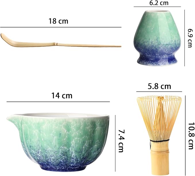 お抹茶4点セット:長さ14cm 高さ7.3cm、容量約500mlの抹茶茶碗と、長さ6.3cm 高さ10.2cmの茶筅、幅6.2cm 高さ6.8cmの茶筅立て、長さ18.2cmの茶杓です。