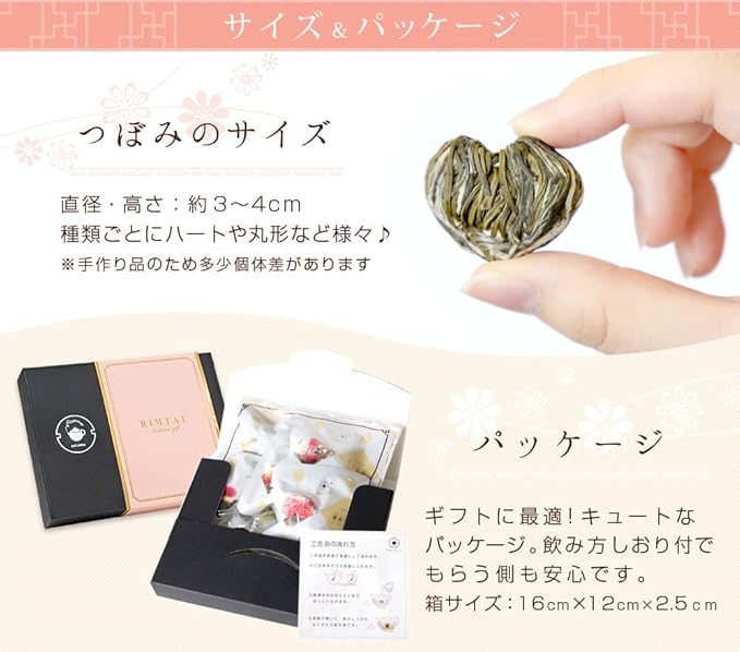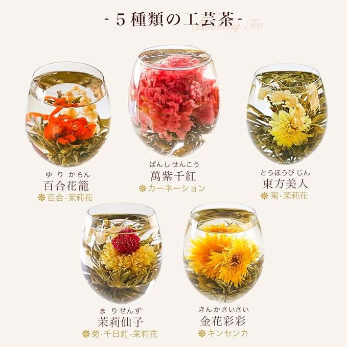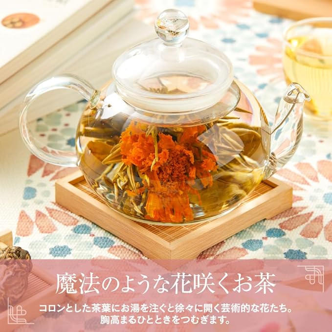✅それは芸術的な花咲くお茶。コロンとした茶葉にお湯を注ぐと徐々に開いてゆく芸術的な花たち。開いた茶葉から色鮮やかな花が開くその様子は まるで魔法のような、おとぎ話のような、不思議な時間を作り出します。 ロマンティックで美しく、そして上品で優雅なひとときを演出してくれるブルーミングティーは 古くから「工芸茶」という名称で広く愛されている芸術茶。あなたもその幻想的で不思議な世界に足を踏み入れてみませんか?