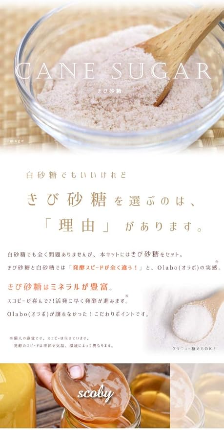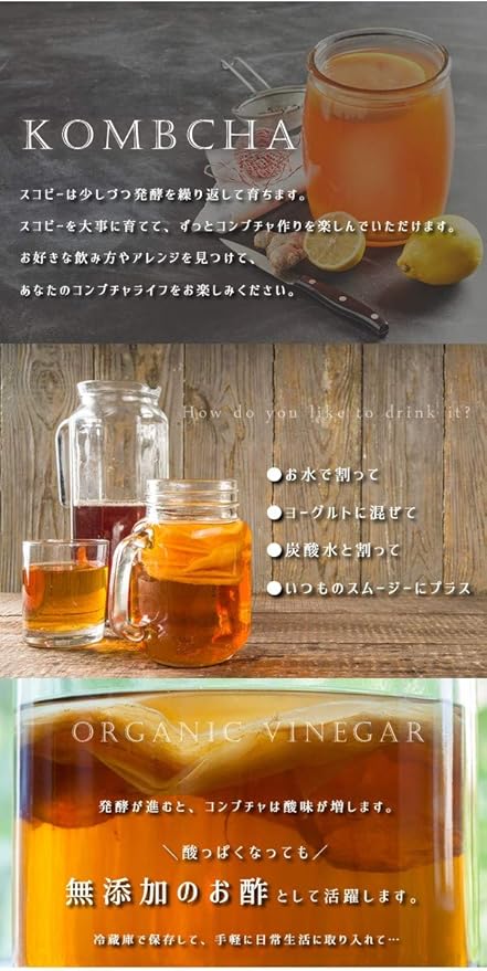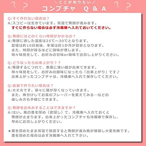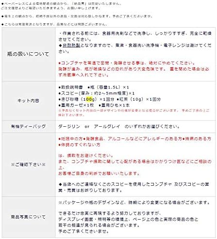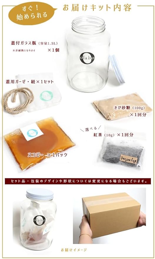 キット内容:●瓶(容量1.5L) 1●スコビー(1パック) 1●紅茶(10g) 1回分●きび砂糖(100g) 1回分●蓋用ガーゼ 1枚●蓋用ひも 1本●取扱説明書