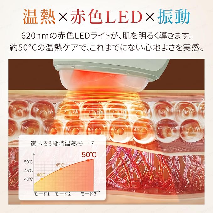 【3段階温熱調節可能&オフ機能付き】 低温(約40℃)・中温(約45℃)・高温(約50℃)の3段階から選べる温熱機能。肌の状態やお好みに合わせて心地よい温度に調整でき、より快適にフェイスケアをお楽しみいただけます。冬の入浴後に使いたくなるリラックスアイテムです。また、温熱機能はオフにもできるため、夏場でも心地よくお使いいただけます。
