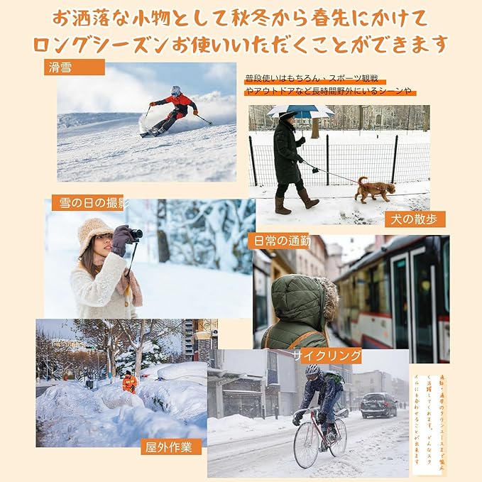 【男女兼用】お洒落な小物として秋冬から春先にかけてロングシーズンお使いいただくことができます。男女問わず快適にお使いいただけます。普段使いはもちろん、スポーツ観戦やアウトドアなど長時間野外にいるシーンや、通勤・通学のタウンユースまで幅広く活躍してくれます。どんなスタイルにも合わせることが出来ます。暖かくて軽いので使いやすいです、プレゼントにもオススメです。