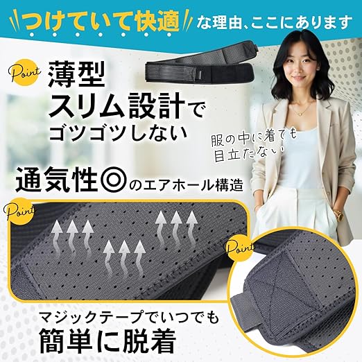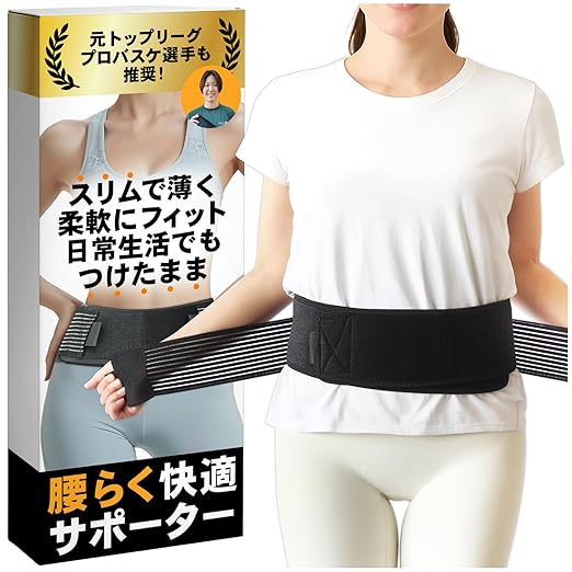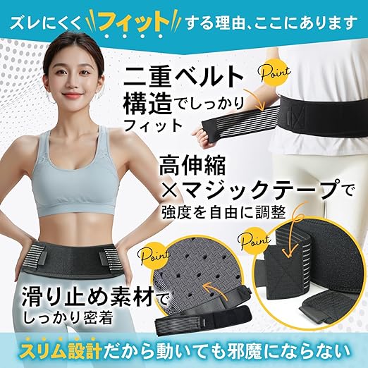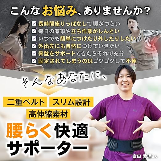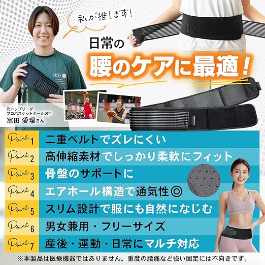 【元プロバスケ富田愛理選手も愛用】 腰サポーター 腰痛ベルト 骨盤ベルト 【薄型軽量タイプxつけ心地の良さにこだわり】【通気性が良くムレないxズレにくい】【二重加圧式x脱着簡単x男女兼用】