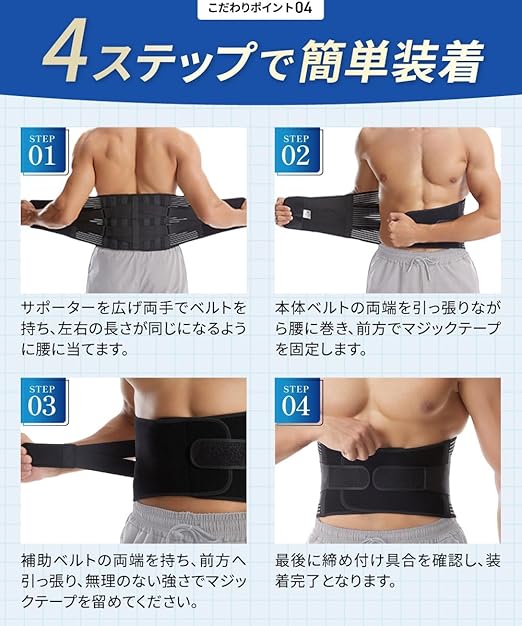 ✅【4ステップで簡単装着】 前面のマジックテープと補助ベルトで、力の弱い方でもラクに装着可能。毎日使うものだからこそ、簡単・確実な着脱を実現しました。