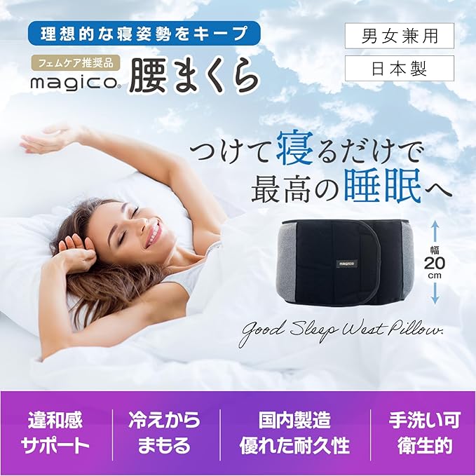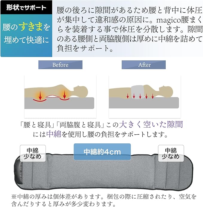 中山式 【内科医 整形外科医監修】中山式 magico 腰まくら 日本製 腰枕 4cm 隙間 埋め 仙腸関節 反り腰 ふんわり クッション 体圧分散 腰用ふとん 横向き 仰向け 安眠 快眠 寝る時 秋 冬 冷え 対策 腰 お腹 ウエスト 温め