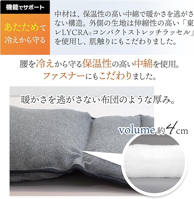 シート状の中綿を腰中央部~脇腹部分に厚めに詰めることで、まるでクッションのような着け心地を実現し、お休みタイムにホッとする安心感。