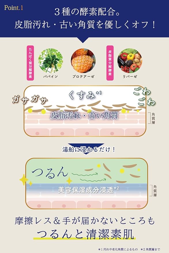 ✅【角質ケア】3種類の酵素(パパイン酵素、プロテアーゼ、リパーゼ)配合。 ゴシゴシ洗いをしなくても皮脂汚れ、古い角質を湯船の中で優しくオフ。 摩擦レス&手の届かないところもつるんとした清潔な素肌に。