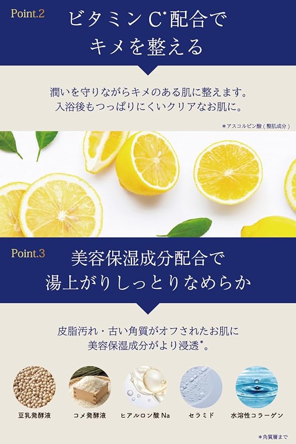 ✅【保湿】美容保湿成分(豆乳発酵液、コメ発酵液、ヒアルロン酸Na、水溶性コラーゲン、セラミド)配合。湯上がりはしっとり美肌。