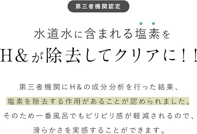 【水道水に含まれる塩素を除去】第三者機関にH&の成分分析を行った結果、塩素を除去する作用があることが認められました。そのため一番風呂でもピリピリ感が軽減されるので、滑らかさを実感することができます。
