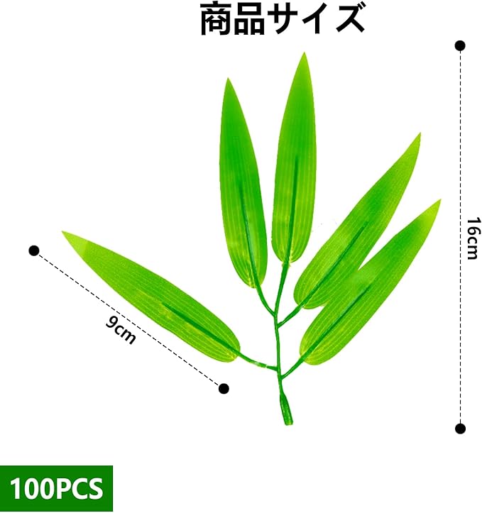 「商品仕様」素材:プラスチック+ワイヤー。セット内容:100枚セット。サイズ:全長約16cm、葉の長さ9cm。七夕や夏祭り、お盆、パーティーなど、夏の風物詩に欠かせない笹飾り