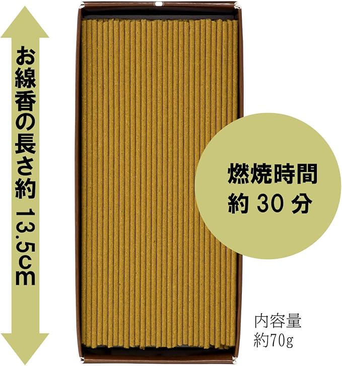 線香長さ:約135mm 箱サイズ:W70 L154 H28mm 香り:サンダルウッド/けむり:ふつう 燃焼時間:約30分 タブ粉・シナ粉・白檀・香料